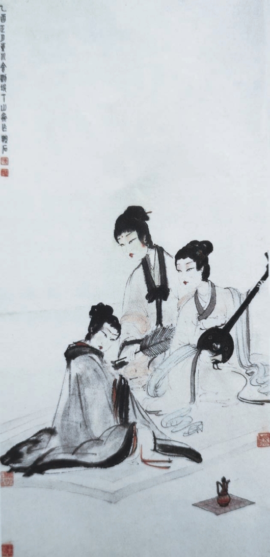 《擘阮图》是傅抱石创作于1945年的一幅仕女画代表作。画面绘三位仕女席地而坐,抚琴而乐。他的仕女画刻意表现古风、古意,有顾恺之、敦煌壁画及陈老莲的痕迹。所绘仕女,气质高贵、神色宁静,超乎现实世界(图6-27)。