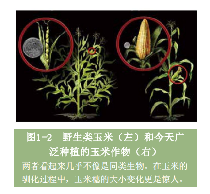 图1-2 野生类玉米(左)和今天广泛种植的玉米作物(右)