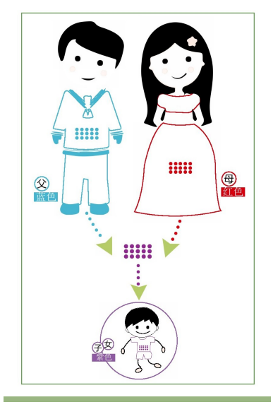 在达尔文看来,一个生物个体的所有器官、组织乃至细胞,都拥有自己专属的泛生子颗粒。手的泛生子记录着每个动物的手掌大小、宽窄、掌纹乃至毛发的生长位置,眼睛的泛生子当然少不了记录眼睛的大小、虹膜的颜色、视力的好坏,等等。在交配过程中,来自父母双方的泛生子融合在一起,共同决定了后代们五花八门的遗传性状——就像红蓝墨水混合以后产生的紫色液体,仍旧带着红色和蓝色的印迹(见图1-3)。