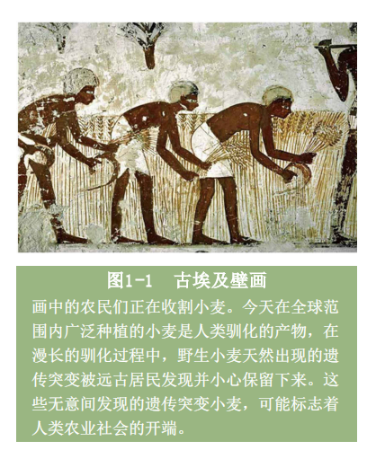 后来,在某个不知名的具体年代,生活在中东地区的远古居民们无意间发现了一些偶然出现的遗传变异小麦。这些小麦的麦穗即便成熟以后,也不会自动脱落。我们可以很容易想象,如果这些变异小麦出现在野外,将注定只有死路一条。因为它们完全无法通过脱落的麦穗散播自己的后代。但这些变异植株对于我们的先祖们来说却无比珍贵,因为这样的遗传突变小麦会大大方便他们在固定时间大批收割麦穗、储存麦粒(见图1-1)!