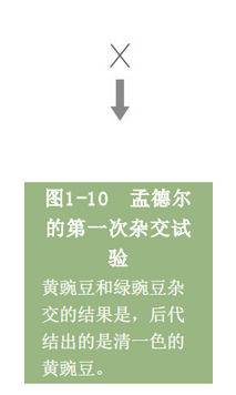 第一轮试验的结果就足够让人震惊了:在孟德尔挑选的全部七种性状方面——不管是种子表皮的颜色、花朵的颜色还是植物的高度,杂交后代都表现出了高度一致的性状来。比如说,黄豌豆和绿豌豆杂交的后代全部是黄豌豆(见图1-10),紫花豌豆和白花豌豆的后代全部是紫花豌豆,高豌豆和矮豌豆的后代全部是高豌豆。换句话说,在杂交一次之后,来自“父亲”或者“母亲”一方的某种性状就彻底消失了,这似乎已经在挑战人们习以为常的融合遗传理念了:难道孩子不是会从父母那里分别继承一些性状才对吗?难道不是父母的泛生子水乳交融构成了孩子的一切吗?