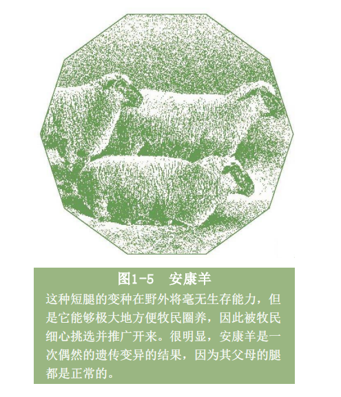 当然,这里头的缘由是很朴素的。农民和牧民们担心的问题也许只是,怎样能培育出更符合人类需要的动物或植物?如果发现了有益于人类的生物性状,怎样保证这样的性状能稳定存在下去为我们所用?一个很经典的例子是达尔文曾经在自己的《物种起源》中讨论过的“安康羊”(见图1-5)。1791年,美国马塞诸塞州的一位牧民偶然在自家的羊圈里发现了一只腿短、跳跃能力极差的小羊。这只小羊立刻被用来繁育更多的后代,因为它的后代根本无法翻过低矮的羊圈,这使得羊群管理变得方便了许多。