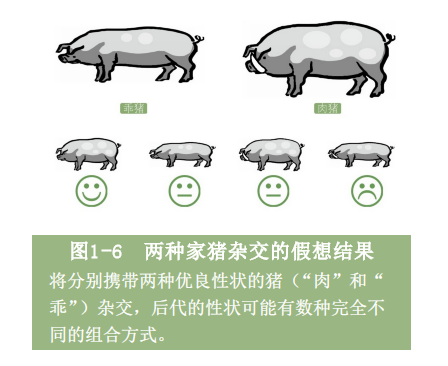 当然了,农牧民们还有一些在技术层面上更复杂的目标,例如怎样把不同的优良性状整合起来(当然,这里的“优良”一词仍然仅对人类适用,对于动植物而言就不一定是什么好事了,比如短腿的安康羊和麦穗不会自动脱落的小麦)。以另一种重要的驯化动物家猪为例,脂肪含量比野猪高、体型比野猪小、圈养在一起也从不打架斗殴的家猪是远古农民们梦寐以求之物。而繁育出这样的猪并不容易。农民们经常会发现,试图把几种优良性状集中起来的尝试往往以失败告终,而成功一般只会在漫长的等待和无数次的失败中偶然且随机地出现(见图1-6)。