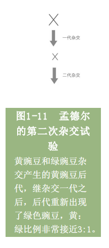 黄豌豆和绿豌豆杂交产生的黄豌豆后代,继杂交一代之后,后代重新出现了绿色豌豆,黄:绿比例非常接近3:1。