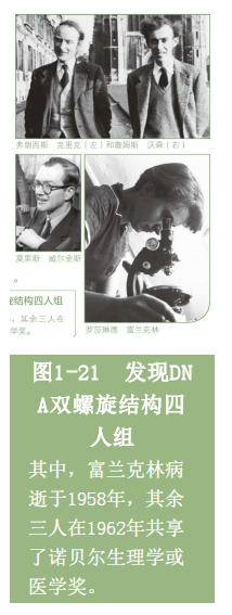 伟大的夏洛克・福尔摩斯曾说过,当你已经排除了其他所有的可能性,不管看起来有多么不可能,剩下的那个就必须是真相(语出柯南・道尔的《斑点带子案》)。仅仅一年以后,1953年,DNA双螺旋模型横空出世。遗传信息的记录和传递方式从此大白于天下。四位科学家,詹姆斯・沃森(James D.Watson)[1]、弗朗西斯・克里克(Francis Crick)、莫里斯・威尔金斯(Maurice Wilkins)和罗莎琳德・富兰克林(Rosalind Franklin)也因此名扬四海(见图1-21)。
