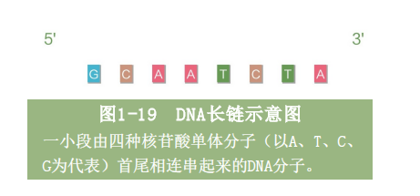 一小段由四种核苷酸单体分子(以A、T、C、G为代表)首尾相连串起来的DNA分子。