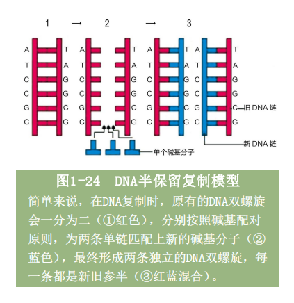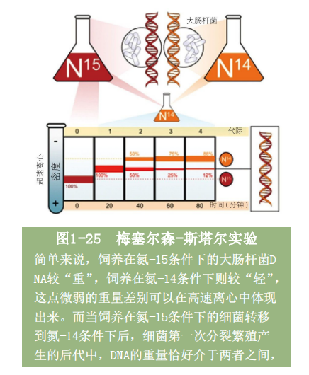在不同的时间点上,梅塞尔森和斯塔尔从一部分细菌中提取DNA分子,然后利用超高速离心的方法判断它们的密度。他们收获的第一代细菌DNA分子的密度,已经偏离了上一代DNA分子的密度,而且其密度恰好介于纯的氮-15DNA和氮-14DNA之间。随着分裂次数的增加,细菌DNA分子的密度继续降低,越来越多地出现在了氮-14DNA的密度区间。对这个结果唯一的解释就是半保留复制模型——每一次的分裂繁衍中,子代细菌获得的都是由一条上一代DNA和一条新生DNA缠绕而成的双螺旋链(见图1-25)!