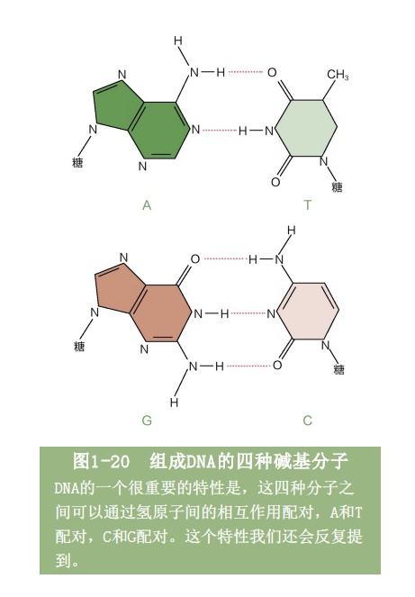 DNA的一个很重要的特性是,这四种分子之间可以通过氢原子间的相互作用配对,A和T配对,C和G配对。这个特性我们还会反复提到。