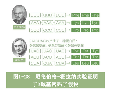 当然,严格说起来,尼伦伯格实验只能证明DNA序列对应氨基酸序列,还不能证明到底是几个碱基对应一个氨基酸。而在此后不久,哈尔・霍拉纳(Har Khorana)又利用更复杂的长链核酸序列,证明了只能是3碱基序列对应一个氨基酸(见图1-28)。在接下来的几年里,许多研究机构之间的白热化竞争最终解密了3碱基密码子全部64种组合所携带的信息。最终我们知道了,大多数氨基酸都对应着两到三种密码子,与此同时,还有三种密码子不负责编码任何氨基酸。它们作为终止信号,竖立在基因DNA序列的尽头,标志着氨基酸装配工作的完成。
