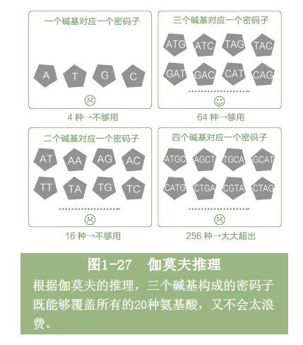 在和克里克的通信中,伽莫夫推测,DNA如果能够指导蛋白质的准确合成,就意味着四种碱基A、T、C、G的排列顺序必须能够指导20种氨基酸的排列顺序。就像我们在故事里提到的,一个简单的思路就是,数个碱基的序列共同决定一个氨基酸。如果是两个碱基分子构成一个氨基酸“密码”,那么仅有的42(16)种组合不足以代表全部的氨基酸;如果是三个碱基形成一个氨基酸“密码”的话,那么43(64)种组合,仅仅比氨基酸数量略高;而如果是四个碱基形成一个氨基酸“密码”的话,那么44(256)种组合似乎就太过浪费了(见图1-27)。因此,伽莫夫推测,DNA指导蛋白质合成的基本原则是相邻三个碱基的序列形成一个独特的密码子,用来指代一种独一无二的氨基酸。