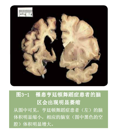 一般而言,这些数量波动不太会影响HTT蛋白的正常功能。但是一旦HTT基因中C-A-G 3碱基重复的数量超过某个阈值,HTT蛋白的功能就会被永久性改变。这些HTT蛋白当中的超长谷氨酰胺重复序列,具有一种可怕的能力:它们可以自发形成巨大的蛋白聚合体。许许多多HTT蛋白能够通过各自的超长谷氨酰胺重复序列两两交联,积沙成塔,构成一个巨大的蛋白三维网络。最终,这个密如蛛网的蛋白网会裹挟着其他与之相结合的蛋白质形成巨大的块状沉淀,在电子显微镜下清晰可见。伴随着这一过程,神经细胞的正常功能乃至生存就会受到严重干扰。随着病程的深入,大脑许多区域会随着神经细胞的不断死亡而萎缩并失去功能。其中突变HTT蛋白影响最深的区域叫作纹状体,它正是控制肢体运动的中枢之一(见图3-1)。因此,亨廷顿舞蹈症患者最早出现的症状正是肢体不受控制地随机舞动,而这也是这种绝症名称的由来。