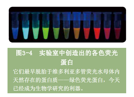 目前在生物医学领域大行其道的重要工具,绝大多数都来自大自然的鬼斧神工,而非实验室中的人工设计。前文中帮助我们传递救命DNA的,是有着高超的细胞入侵能力的小小病毒。在全球数不清的生物实验室里,生物学家用一种能够在紫外光照射下发出幽幽绿光的蛋白质——绿色荧光蛋白——追踪细胞中各种物质的产生、运输和定位(见图3-4)。绿色荧光蛋白并非人类的智慧创造,而是脱胎于一种能够发出幽幽绿光的海洋生物——维多利亚多管发光水母。