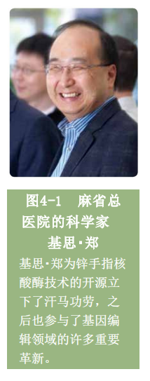 美国麻省总医院的韩国科学家基思・郑(Keith Joung,见图4-1)就是其中的代表人物。郑曾经是我们前文提到的卡尔・帕博实验室的博士后,他和锌手指核酸酶的缘分也是从帕博实验室开始的。在帕博离开学术界前往圣加蒙公司就职时,郑选择了留在学术界,致力于开发锌手指核酸酶组装和筛选的新技术平台。也就是说,从郑独立建立实验室的第一天起,他的目标就是亲手打破由自己参与建设的锌手指核酸酶的技术牢笼!