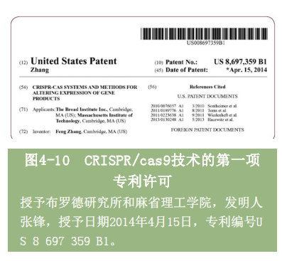 2014年4月15日,美国专利与商标局在万众瞩目中,将与CRISPR/cas9技术相关的第一项专利,授予了张锋和他所在的布罗德研究所(见图4-10)。这项内涵深广的专利涵盖了CRISPR/cas9技术在所有真核生物方面——包括各种动物、农作物以及人类自身——的应用。