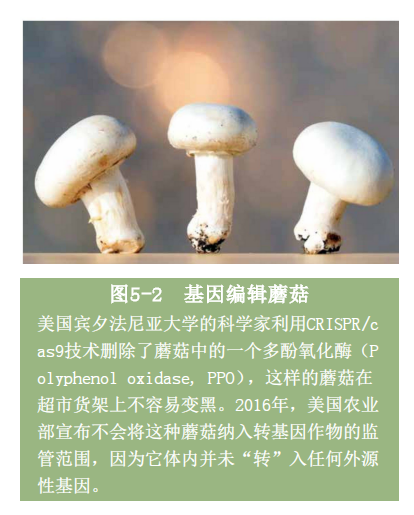 这样的思路已经不仅仅是理论上的可能性了。在过去五年间,已经有几种利用基因编辑技术开发的农作物进入了大田试验,乃至已经进入市场。土豆在冷藏过程中,淀粉会缓慢分解成蔗糖、葡萄糖和果糖,之后如果要油炸土豆的话,糖类在高温下会变成丙烯酰胺——一种致癌物质。而Calyxt公司利用“神话”核酸酶进行定点手术操作,破坏了土豆基因组的一个基因。这样一来,土豆的淀粉就不会分解,也就可以减少致癌物质丙烯酰胺的产生了。中国科学院的科学家同样利用“神话”核酸酶技术破坏了小麦基因组里与白粉病相关的3个致病基因,使小麦免受白粉病的困扰。这里当然也包括各种利用CRISPR/cas9技术改造的农作物,比如说美国宾夕法尼亚大学的科学家破坏了蘑菇基因组里的褐变基因,这样超市货架上的蘑菇就不会轻易变黑变质了(见图5-2);中国和韩国的科学家破坏了肉猪基因组里抑制肌肉生长的基因,生产出了瘦肉型的肉猪。