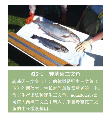 这方面的著名例子是所谓的Bt“毒”蛋白。在不少转基因玉米品系中,都转入了来自苏云金芽孢杆菌的基因。这些基因能够产生对鳞翅目昆虫(比如臭名昭著的玉米螟和玉米根虫)有毒性的蛋白质,因此,转基因玉米就自带了生物杀虫剂的功能。而反对者担心的是,这些“毒”蛋白也许同样会对人体有害。即便是那些看起来没那么“毒”的转基因食物,比如转基因三文鱼(见图5-1)身上携带的促进生长和抗冻的基因,也会有反对者担忧引入他者的基因会干扰三文鱼自身的蛋白质合成,从而产生意想不到的未知毒素,等等。