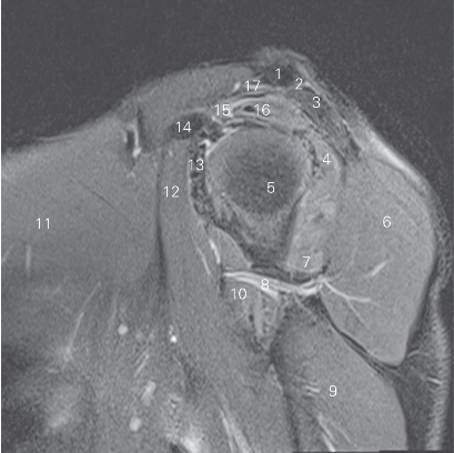 图4-5 经肱骨头上份的横断层MR T2WI FS