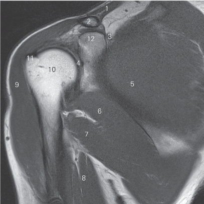 图4-12 经肱骨小结节的冠状断层MR T1加权图像