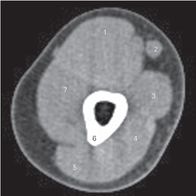 图4-25 经上臂中份的横断层CT图像(软组织窗)
