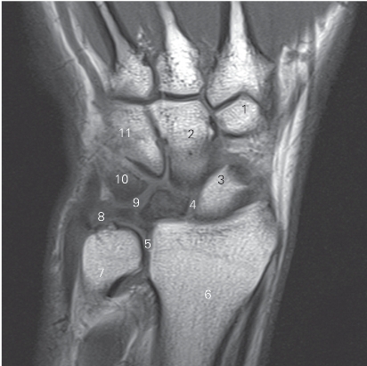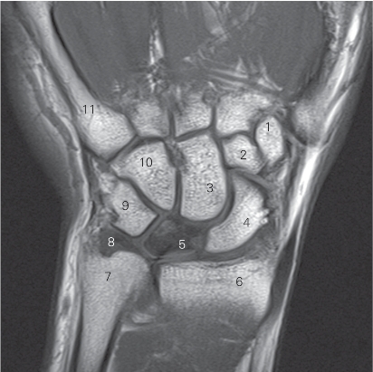 图4-55 经下尺桡关节的冠状断层MR T1加权图像