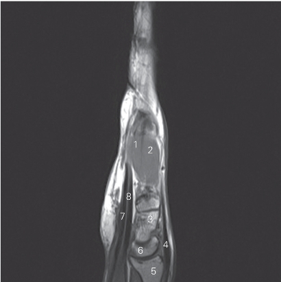 图4-47 经掌骨中远四分之一的横断层MR T1加权图像