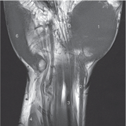 图4-53 经大多角骨的冠状断层MR T1加权图像