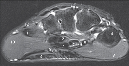 图4-46 经掌骨近侧四分之一的横断层MR T2WI FS