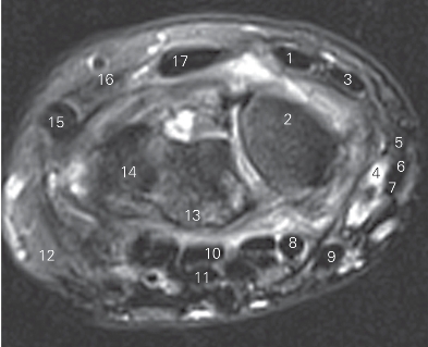 图4-42 经近侧列腕骨近侧份的横断层MR T2WI FS