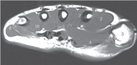 图4-48 经掌骨远侧四分之一的横断层MR T1加权图像