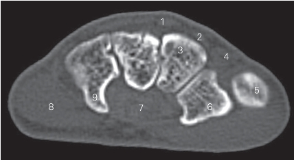 图4-40 经远侧列腕骨的横断层CT图像(骨窗)