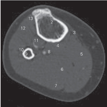 图5-32 经小腿上份的横断层CT图像(骨窗)