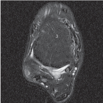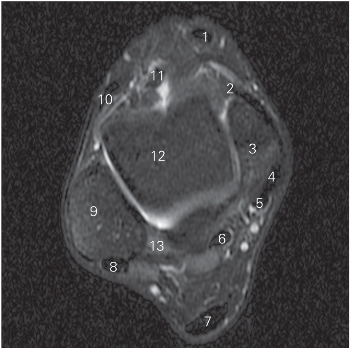 图5-37 经踝关节下方的横断层MR T2WI FS