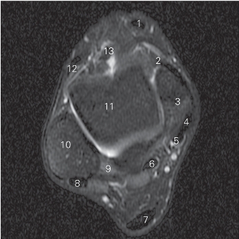 图5-36 经远侧胫腓关节的横断层 MR T2WI FS