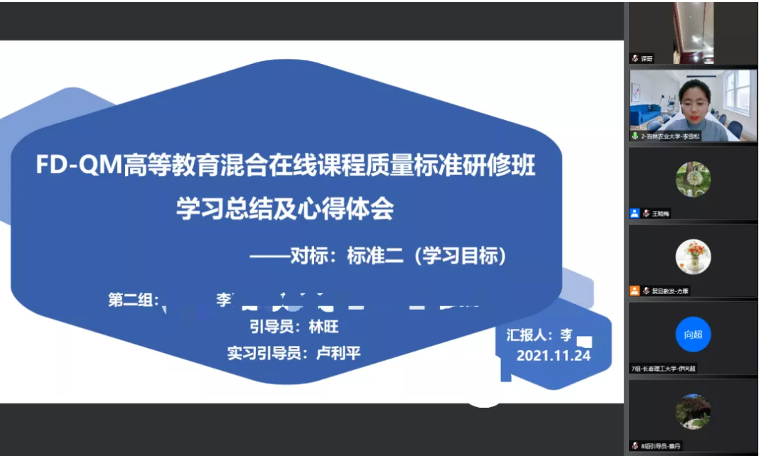 11月15日,参训学员与引导员第一次线上见面。复旦大学教师教学发展中心主任陆昉教授介绍研修班的目的,并向学员提出研修的要求;丁妍副主任介绍FD-QM标准基本内容,帮助学员理解混合在线课程质量标准内涵。