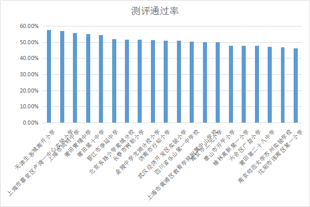测评是线上阅读活动中检验学生阅读效果,提供阅读大数据分析的手段和数据来源之一。测评通过率是反映学生阅读能力、学校和学生对阅读测评积极性的指标之一。由上图可知,在全国测评通过率排名前20的机构中,天津生态城南开小学以57.67%的测评通过率位居第一,其他排名前20的机构中,测评通过率达到46.40%以上。