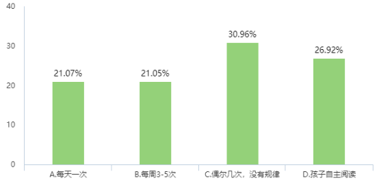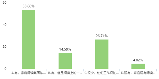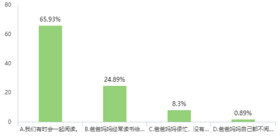 从问卷反馈出,本届互动的家长自己保持有良好的阅读习惯,活动不仅激发孩子的兴趣,同时也促进家长的阅读。从学生和家长两种角色的问卷反馈出,在亲子阅读方面,活动发挥出了重要的作用。70%以上的家长陪孩子一起阅读,21%以上的家庭亲子阅读每天发生,亲子阅读已逐渐发展为常态。其中,小学低中段90%以上的孩子提到家长会和他们一起阅读,高年级68%以上的孩子提到,家长会和他们一起阅读,但有时无法帮助他们解决阅读上的问题。家庭阅读氛围的营造,还需家长继续努力。