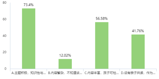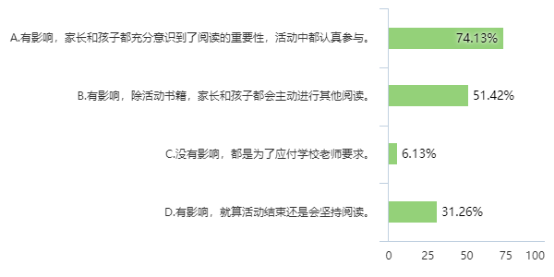 绝大部分家长认为本届活动的主题积极,知识性与趣味性一体,内容丰富,孩子可检测也可发表作品,并且设有亲子共读,作为家长参与度更高了。活动形式上,绝大多数家长认为本届活动形式科学、新颖、丰富,能激发学生阅读并有效跟进阅读效果。