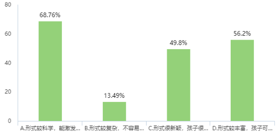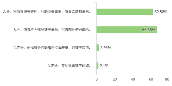 关于活动中的互动,94%的学生表示非常喜欢,符合互联网原住民的习惯和时代的社交性。大多数家长也会鼓励孩子进行创作与有效互动。