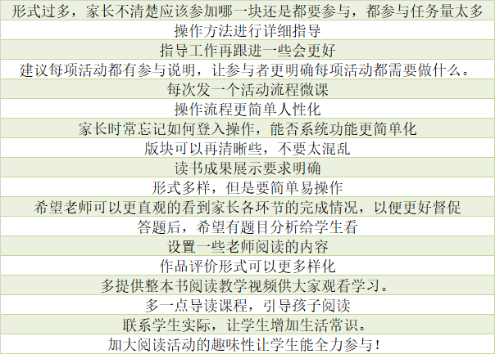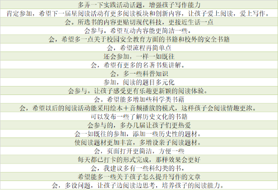 但仍有部分老师和家长觉得活动流程比较复杂,对此,我们应考虑活动形式和流程上更简化,同时加强对于使用者的培训。在服务的建议上,老师和家长积极肯定了活动服务,也提出了更详细的操作流程资料与增加活动前期对家长进行活动培训的需求,表明老师和家长对于活动非常的用心,希望可以给学生更好的指导。对于本期活动较往期来说,大部分用户肯定了活动的进步,对于下一期活动,大家表达了美好的期待。