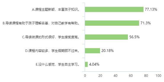 绝大部分老师认为阅读课程主题新颖,丰富孩子的知识,有助于孩子理解名著,对自己的教学也有帮助。课程形式上,大多数老师认为导读微课的形式很好,学生接受度高。