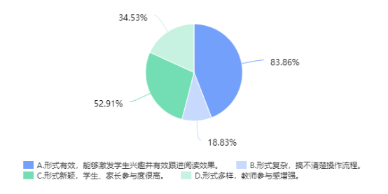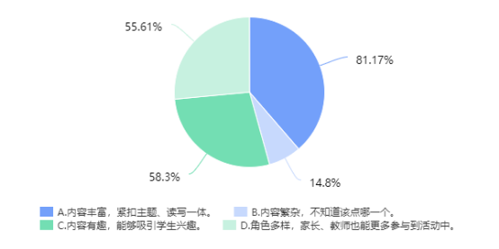 绝大部分老师认为本届活动内容丰富,紧扣主题,读写一体,能够吸引学生兴趣,并且角色多样,家长及教师也能更多地参与到活动中。活动形式上,绝大多数教师认为本届活动形式有效,能够激发学生兴趣并有效跟进阅读效果,并且形式新颖多样,家长、教师参与感较强。