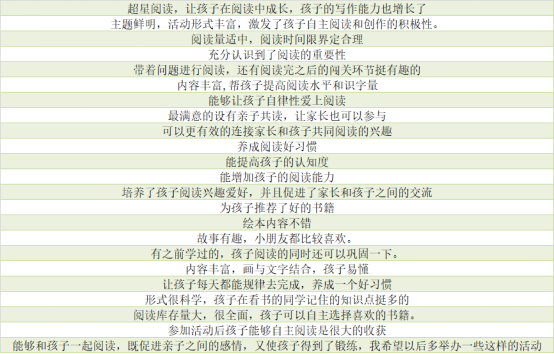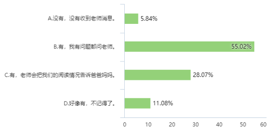 对于亲子共读板块,70%以上的教师认为共读形式很好,能和家长、学生共同讨论。其中的“刘教授经典导读——21天共读打卡”,64%以上的教师表示很受刘教授启发,内容对自己的阅读教学很有帮助。77%以上的教师认为朱奎童话导读很有趣,能帮助孩子们培养创造力和想象力。家长也很受用,能帮助理解孩子成长过程中的问题。亲子共读活动形式很新颖,使家庭与学校达成共识,形成教育的合力,共同用良好的习惯去引领孩子、教化孩子,为更多的孩子点亮阅读的明灯。