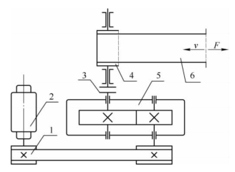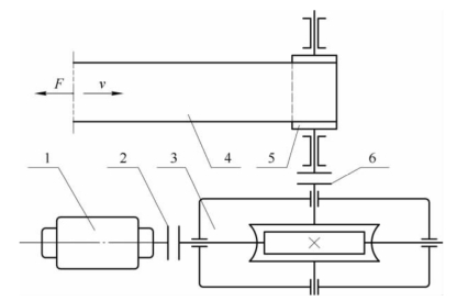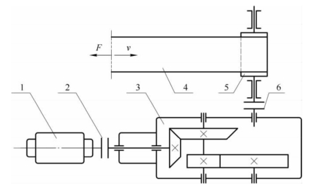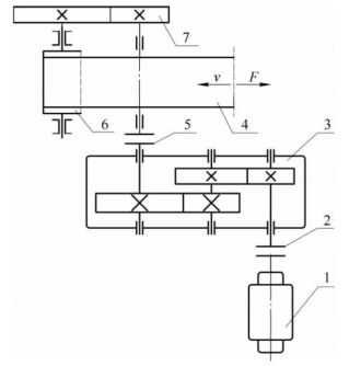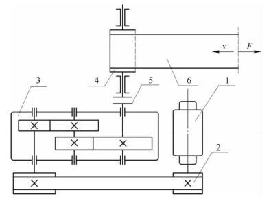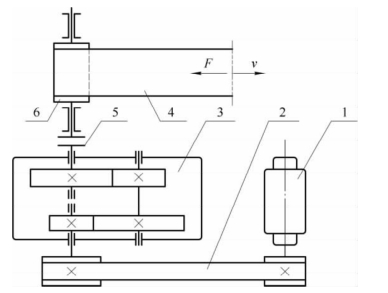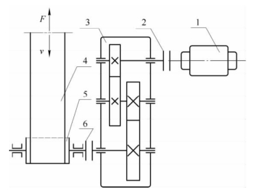 1—电动机;2—V带传动;3—同轴式二级圆柱齿轮减速器;4—运输带;5—联轴器;6—传动滚筒