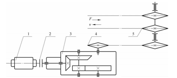 1—电动机;2—联轴器;3—圆锥-圆柱齿轮减速器;4—链传动;5—运输链