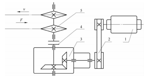 1—电动机;2—V带传动;3—一级圆锥齿轮减速器;4—联轴器;5—运输链