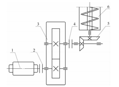 1—电动机;2、4—联轴器;3—一级圆柱齿轮减速器;5—开式圆锥齿轮传动;6—输送螺旋