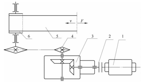 1—电动机;2—联轴器;3—一级圆锥齿轮减速器;4—链传动;5—运输带;6—传动滚筒