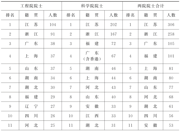 表4-3 中国各省市两院院士人数排名(按籍贯)