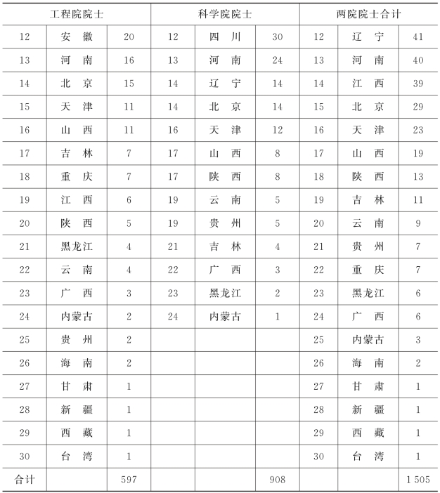 笔者从网易订阅频道搜索到中国各省市两院院士数量(见表4-3),表中是按籍贯排名的,不一定准确,仅供参考。