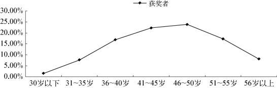 大国工匠是高技能人才的优秀代表,其成长过程必然遵循高技能人才成长规律。关于高技能人才成长规律,国内研究文献众多,其中最有代表性的文献是2018年中国石化出版社出版的《干出来的技师》。该书把高技能人才成长规律划分为一般规律和特殊规律,一般规律主要体现在阶段效应规律和梯次成长规律两个方面。作者给出了高技能人才成长周期与岗位贡献率示意图,把高技能人才成长周期划分为6个阶段:适应期,稳定期,发展期,成熟期,衰退期。笔者通过对历届中华技能大奖获得者的统计分析研究,根据国家有关退休政策,每隔5年为一个频数段,描述大国工匠的技能成长(见图9-1),笔者称之为大国工匠生命工作周期与技能成长规律。该书作者把职业(工种)依从规律和岗位实践效应规律看作高技能人才自身特点的特殊规律,并对高技能人才成长影响因素和高技能人才评价做了调查分析。
